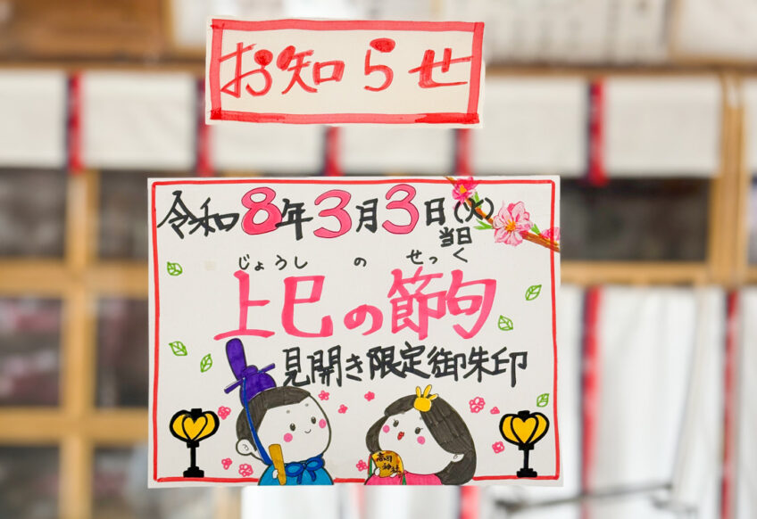 節句限定ご朱印~上巳の節句~ ・3月3日(火) ・10:00~18:00頃まで(状況により延長します) ・お初穂、800円 ・見開き直書き 桃の節句や上巳(じょうし)の節句と称される日本五節句の一つ。 本来は紙の人形(...
