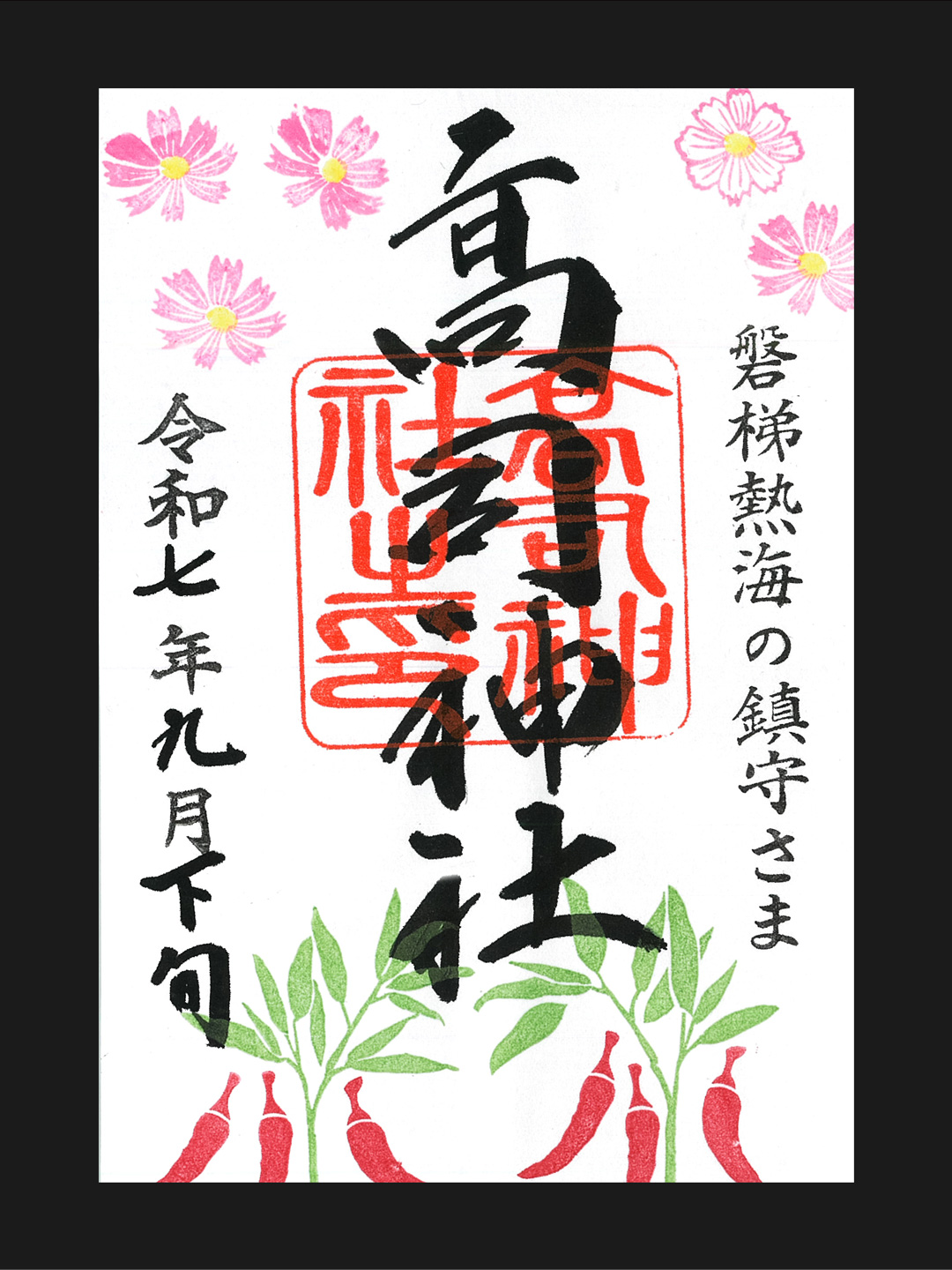 9月は秋野菜シリーズ。 上旬は駐車場に植えていたカボチャとコスモス 中旬・下旬は花壇に植えていた秋ナスと唐辛子になりました。 五節句の一つ9月9日当日限定、重陽の節句ご朱印でした。