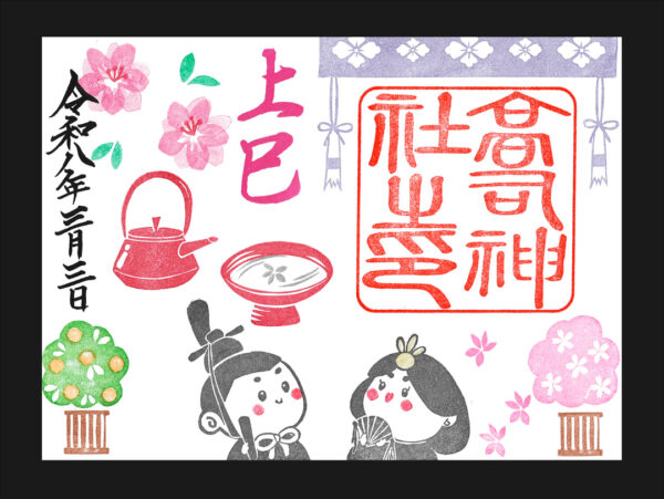 ご朱印から当社を思い出して欲しいとの思いから、絵柄は神社境内の風景や飾り物、季節の植物などをモチーフに神職自ら「消しゴミはんこ」を彫って添えています。季節の移ろいと共にご朱印の絵柄も変化して行きます。